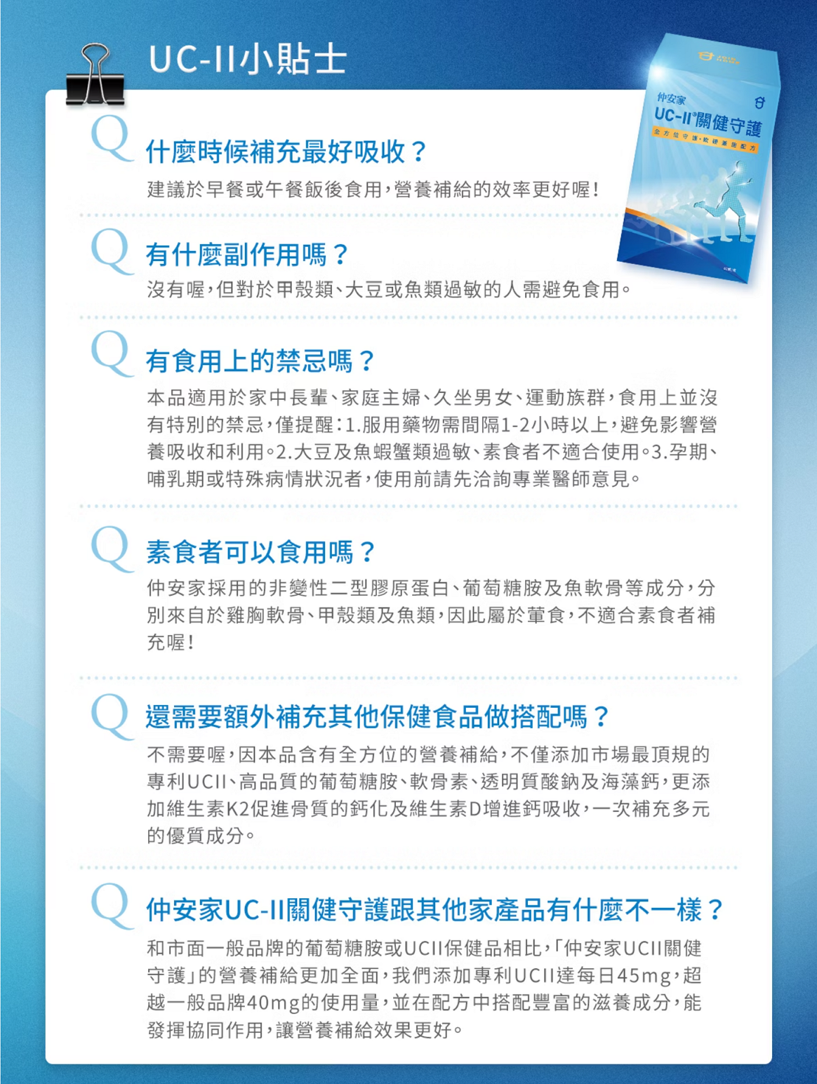 採用專利 UC-II® 未變性第二型膠原蛋白,小劑量即可支持關節靈活度與行動力,適合久坐久站、運動族、銀髮族或希望維持關節順暢的人每日保養。