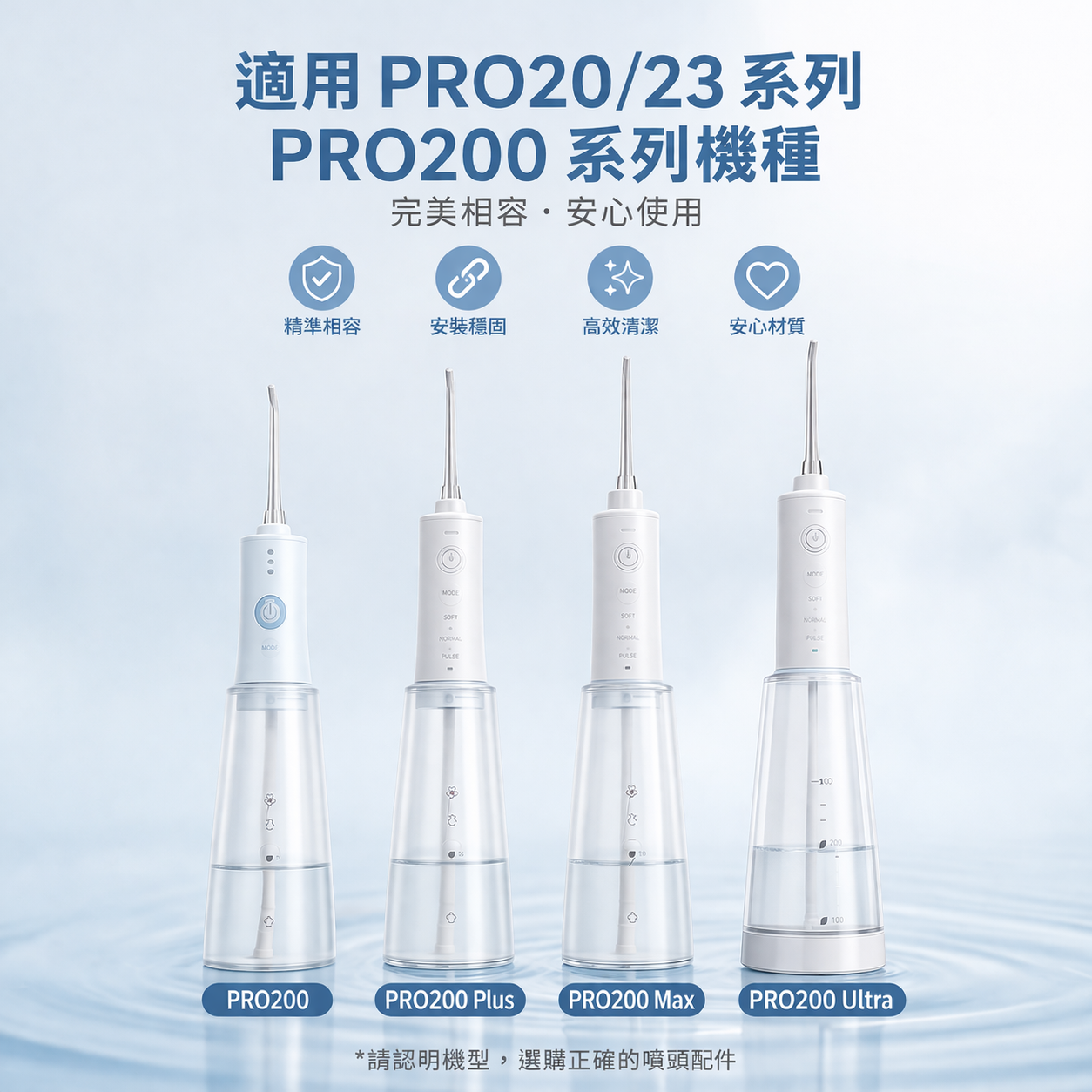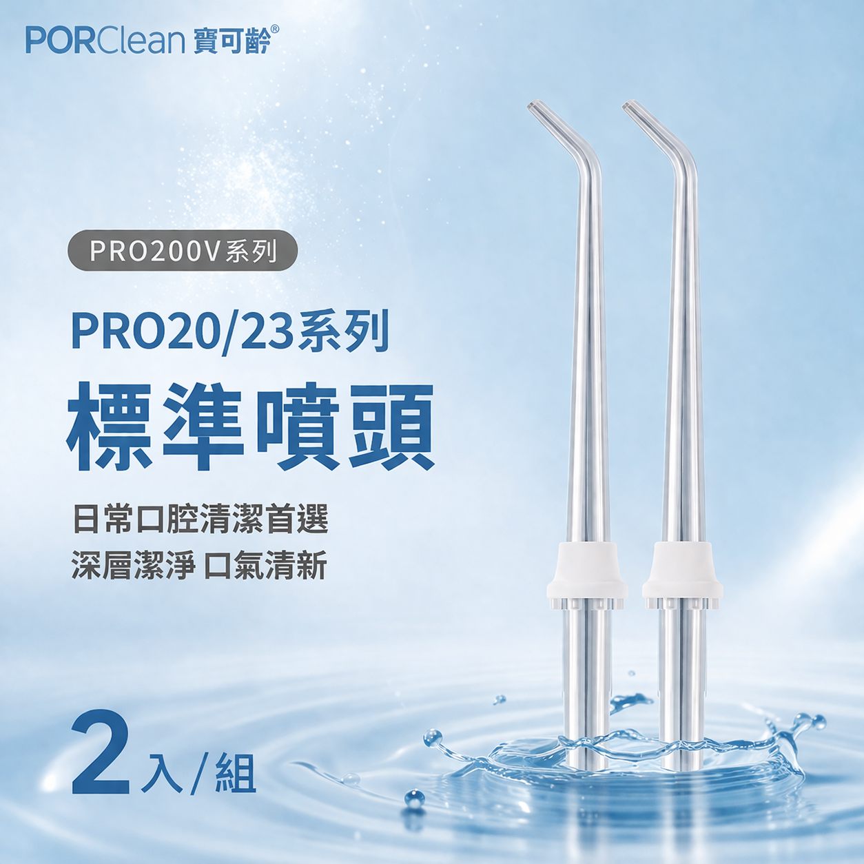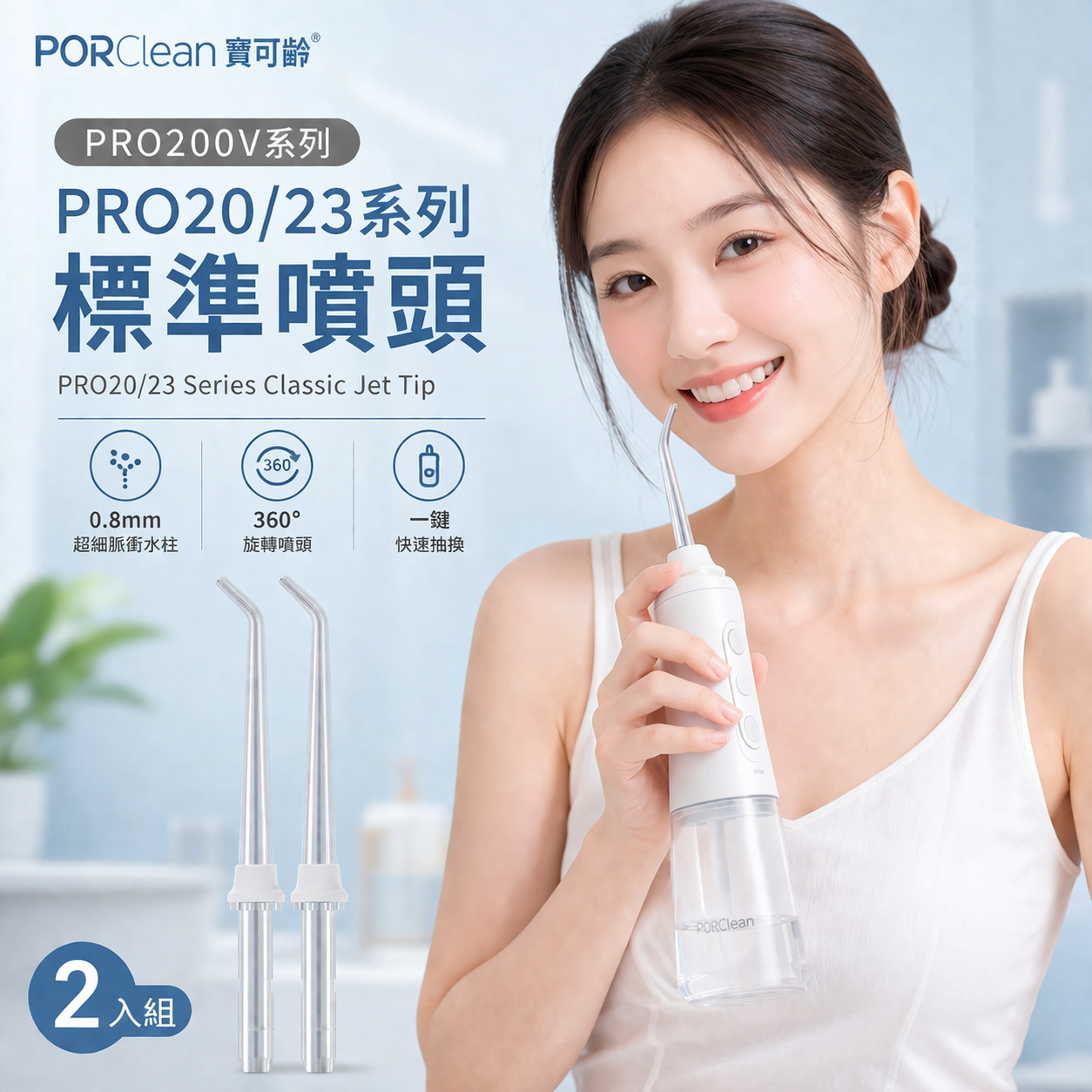 這款商品為 PORClean 寶可齡 PRO200V 系列對應的 PRO20/23 系列標準噴頭,從商品圖片可見,為 2 入組設計,屬於日常口腔清潔使用的經典型噴頭。對於平常有固定使用沖牙機習慣的人來說,標準噴頭通常是最常用、也最容易融入日常清潔流程的配件類型。商品圖示中可見其主打 0.8mm 超細脈衝水柱、360° 旋轉噴頭與一鍵快速抽換設計,整體訴求清楚,適合希望清潔更靈活、替換更方便的使用者。