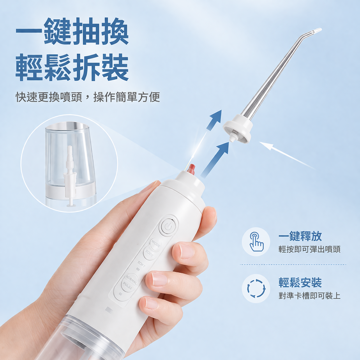 建議依照商品對應機型安裝使用。從商品圖示可見,本品具一鍵快速抽換設計,可依日常使用需求進行替換。使用前可先確認噴頭是否已正確安裝穩固,再搭配沖牙機主機進行日常口腔清潔。若有多人共用設備,建議可分開標示使用,較方便日常管理。實際安裝方式、適配型號與使用注意事項,請以商品外包裝或賣場說明為準。